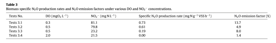 3. 數據來自表3:測量了不同DO和亞硝酸鹽濃度下的特異性N2O生產率和N2O排放因子。研究意義是量化N2O排放,顯示DO和底物濃度對溫室氣體產生的影響,為減少N2O排放提供操作指導。