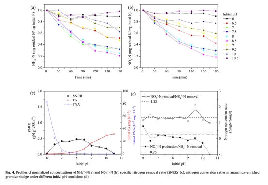 4. 數據來自圖4:測量了不同初始pH下NH4?-N和NO2?-N的歸一化濃度剖面、SNRRs和氮轉化比。研究意義是確認pH 6.5-8.5為最優范圍,此時低FA和FNA濃度最小化抑制,確保厭氧氨氧化主導氮去除,并顯示pH偏離導致途徑偏移。