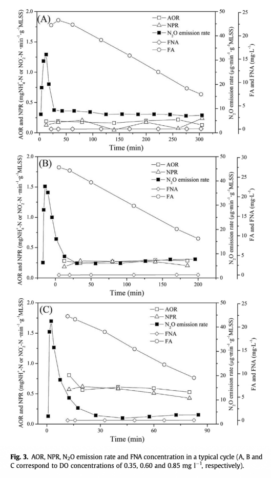3 數(shù)據(jù)來自圖3:測量了氨氧化率(AOR)、亞硝酸生產率(NPR)、N2O排放率和FNA濃度在周期內的變化。研究意義是表明AOR與N2O排放率負相關,而FNA無顯著影響,幫助理解N2O生產的主要驅動因素。