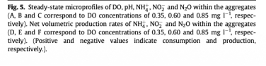 4 數(shù)據(jù)來自圖5:使用微電極測量了污泥聚集體內部的DO、pH、NH4?、NO2?和N2O的微剖面及凈體積速率。研究意義是直接可視化微觀環(huán)境,顯示外層(<1000μm)為高活性硝化區(qū),內層(1000-2500μm)在低DO下形成缺氧區(qū),增強反硝化途徑的N2O生產。