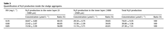 5 數(shù)據(jù)來自表3:量化了不同DO濃度下污泥聚集體外層和內層的N2O生產比例。研究意義是證實低DO時N2O生產從反硝化途徑增強,為控制N2O排放提供微觀證據(jù)。
