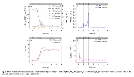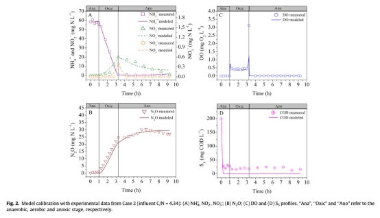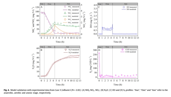 研究意義在于這些數(shù)據(jù)用于校準(zhǔn)和驗(yàn)證數(shù)學(xué)模型,確保模型能準(zhǔn)確捕捉AOA過程中氮轉(zhuǎn)化和N2O產(chǎn)生的動態(tài)。通過比較模擬與實(shí)測數(shù)據(jù),可以驗(yàn)證模型結(jié)構(gòu)合理性,并深入分析N2O產(chǎn)生途徑的貢獻(xiàn),如識別AOB反硝化為主導(dǎo)機(jī)制。數(shù)據(jù)來自不同C/N比案例,有助于理解操作條件對N2O積累的影響,為優(yōu)化工藝減少溫室氣體排放提供依據(jù)。