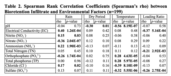 4. 測量了環境因素和場地特性數據:包括采樣時累積降雨深度、降雨前干旱期、日平均溫度和負荷比。這些數據用于分析與生物滯留設施進水(表3)和滲濾液(表2和圖6)水質參數的相關性。研究意義在于識別影響生物滯留設施營養鹽動態的關鍵驅動因素,例如溫度加速營養鹽循環,干旱期促進硝酸鹽積累,降雨量對污染物的稀釋和沖刷作用等。