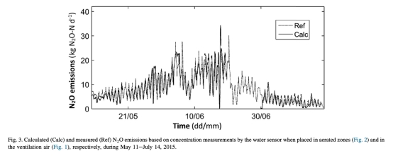 3 測量了基于水濃度和廢氣濃度計算的N2O排放量,數據來自圖3,顯示兩者趨勢一致。