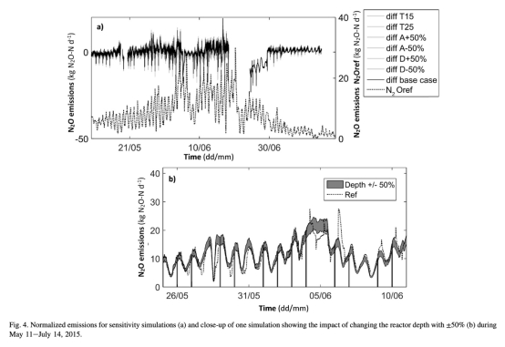 研究思路包括在瑞典Kappala污水處理廠進行為期兩個月的實驗,在封閉活性污泥工藝中同步測量廢氣通風系統中的N2O濃度和氣流速(作為參考),同時使用Unisense的Clark型微傳感器測量水相溶解N2O濃度和溫度。應用基于傳質理論的數學模型,根據溶解N2O數據計算排放量,并與廢氣測量結果對比。進行敏感性分析,測試模型參數(如傳感器校準溫度、反應器尺寸等)變化對估算的影響,以評估模型穩健性。