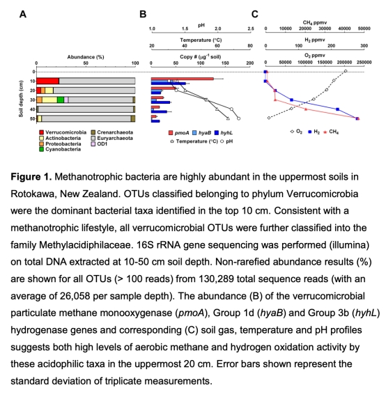 1. 土壤中甲烷和氫氣濃度剖面數據:數據來自圖1。研究意義在于顯示在土壤表層(0-20厘米)甲烷和氫氣濃度急劇下降,表明高氧化活性,與疣微菌門甲烷氧化細菌的豐度相關,證實這些細菌在自然環境中同時氧化甲烷和氫氣。