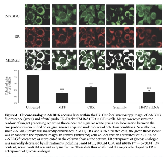 3 2-NBDG在內質網中的定位數據:來自圖4。共聚焦顯微鏡顯示葡萄糖類似物與內質網探針共定位,且此共定位受處理影響。意義在于直接證實內質網參與葡萄糖代謝。