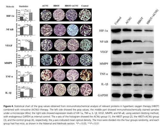 3. 分子表達水平(HIF-1α、TNF-α、IL-1β、VEGF、MMP9和NF-kB):數(shù)據(jù)來自表2和圖4,通過免疫組化和Western blot測量,研究意義是探討分子機制。這些因子在HBOT組和聯(lián)合組中表達降低,意義在于表明HBOT通過調(diào)節(jié)缺氧和炎癥相關(guān)通路來抑制腫瘤。