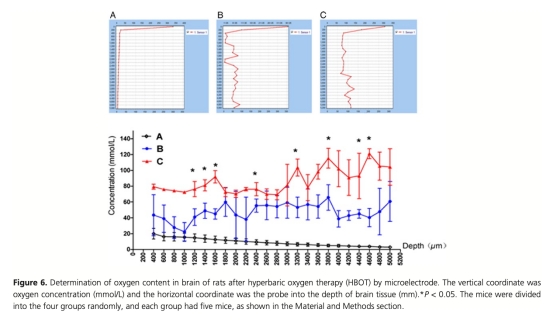 使用丹麥Unisense微電極測量氧分壓(PO2)的數(shù)據(jù)(圖6)顯示,HBOT處理后小鼠腦組織和腫瘤組織的PO2顯著高于正常水平,這直接證實了HBOT能緩解腫瘤缺氧微環(huán)境。研究意義在于,這一測量為HBOT的作用機制提供了關(guān)鍵實證:缺氧是膠質(zhì)瘤進展的重要因素,通過提高PO2,HBOT可能逆轉(zhuǎn)缺氧誘導的分子變化(如HIF-1α上調(diào)),從而抑制腫瘤增殖和炎癥反應(yīng)。這解決了以往關(guān)于HBOT對癌癥療效爭議的核心問題,即缺乏直接的PO2監(jiān)測數(shù)據(jù),并支持HBOT作為 sensitizer 的合理性。