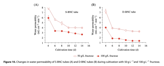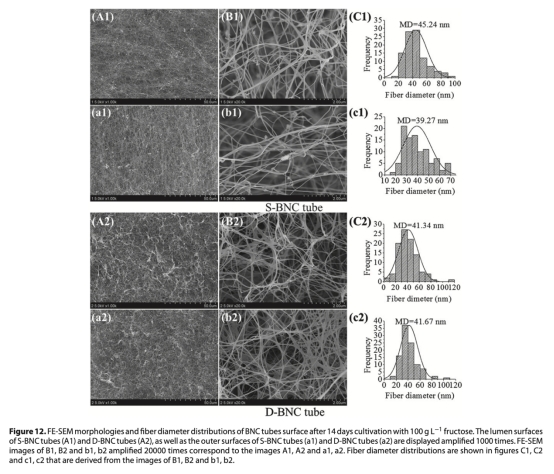 結論是果糖作為碳源比葡萄糖更利于BNC生產,賦予更強機械性能;D-BNC生物反應器由于氧氣供應更好,產量更高,管結構均勻,性能優異,適用于人工血管等醫療假體;S-BNC管呈層狀結構,性能較弱,可作為復合材料基礎。通過調節糖類型、濃度和培養時間,可控制BNC管性質。