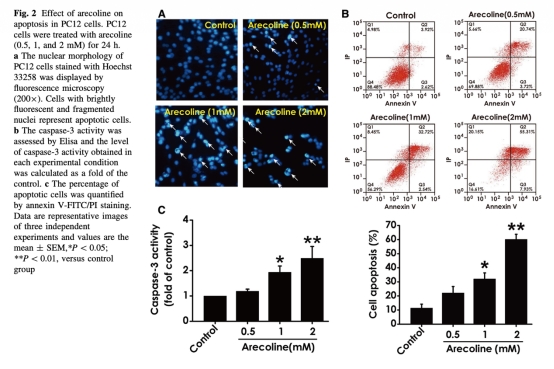 2 凋亡指標測量(圖2):包括Hoechst染色顯示核染色質凝集、Annexin V/PI流式細胞術顯示凋亡率增加、caspase-3活性升高。研究意義:證實檳榔堿誘導細胞凋亡,涉及caspase通路激活。