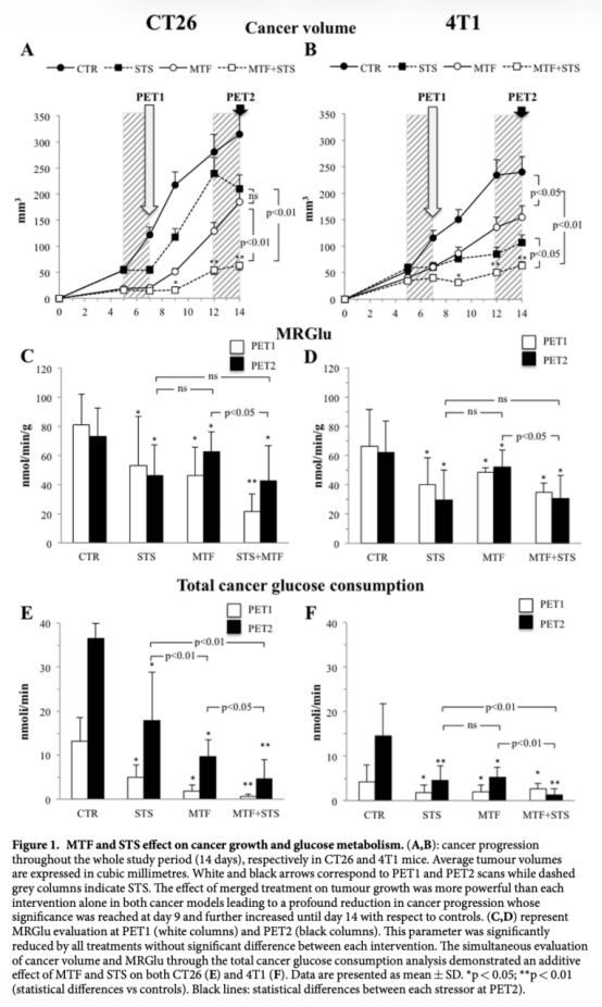 論文摘要指出,結(jié)合二甲雙胍(MTF)和短期饑餓(STS)能顯著損害結(jié)腸癌(CT26)和乳腺癌(4T1)的代謝和生長(zhǎng)。饑餓引起的糖酵解通量損害被二甲雙胍通過(guò)干擾己糖激酶II活性所增強(qiáng)。聯(lián)合治療附加性損害氧化磷酸化:二甲雙胍?guī)缀鯊U除復(fù)合物I功能;饑餓導(dǎo)致OXPHOS解偶聯(lián),并放大呼吸復(fù)合物II和IV的活性,從而結(jié)合大量ATP耗竭與活性氧顯著增加。更重要的是,聯(lián)合治療在實(shí)驗(yàn)?zāi)P椭猩羁虛p害癌癥葡萄糖代謝,幾乎廢除病變生長(zhǎng)。結(jié)果強(qiáng)烈表明能量代謝是減少癌癥進(jìn)展的有希望靶點(diǎn)。