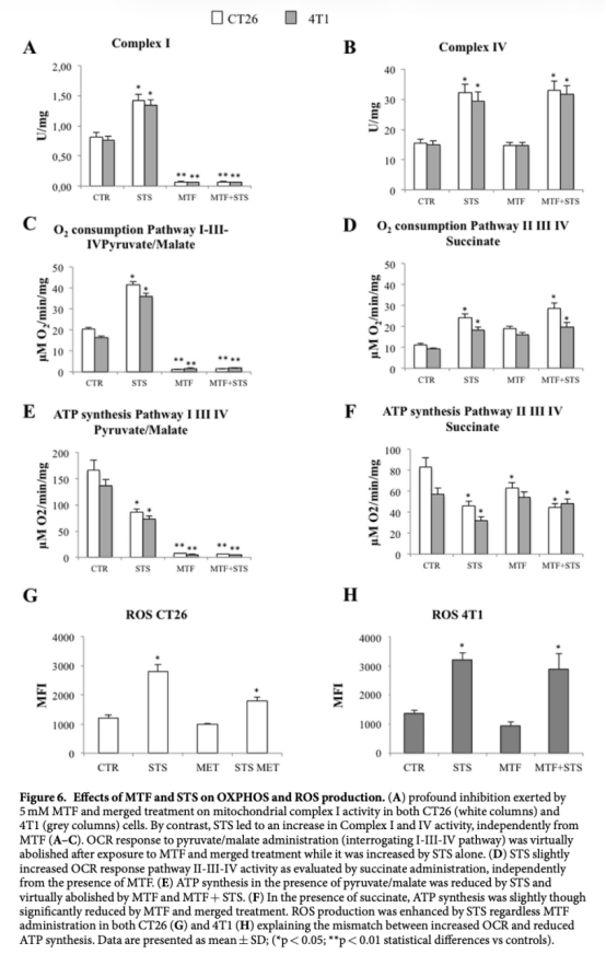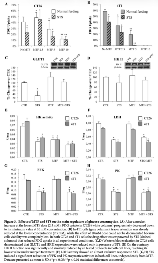 研究思路包括體內(nèi)和體外實(shí)驗(yàn)。在體內(nèi),使用小鼠模型(CT26結(jié)腸癌和4T1乳腺癌),通過(guò)成像研究(如微PET掃描)評(píng)估腫瘤生長(zhǎng)和葡萄糖代謝變化。動(dòng)物分為對(duì)照組、STS組、MTF組和聯(lián)合治療組,監(jiān)測(cè)腫瘤體積、葡萄糖消耗率等。在體外,使用細(xì)胞培養(yǎng)(CT26、4T1細(xì)胞和人類(lèi)成纖維細(xì)胞作為對(duì)照),通過(guò)測(cè)量FDG攝取、酶活性、ATP濃度、氧消耗率(OCR)、活性氧(ROS)等,評(píng)估二甲雙胍和饑餓對(duì)糖酵解和氧化磷酸化的影響。方法包括蛋白質(zhì)組學(xué)、Western blot、酶活性測(cè)定、免疫熒光等,以闡明機(jī)制。