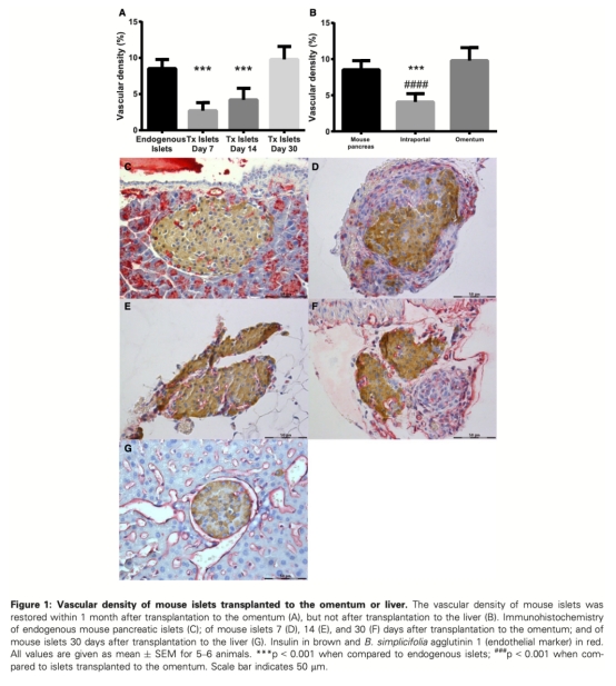 1 血管密度數據:來自圖1(小鼠胰島)和圖2(人類胰島)。研究意義是顯示大網膜移植的胰島血管密度在移植后一個月內完全恢復,而門靜脈移植恢復延遲,表明大網膜提供更快的血管化支持,有利于胰島存活和功能。