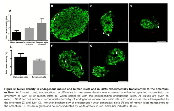 4 神經密度數據:來自圖6。研究意義是顯示大網膜移植的胰島神經支配在移植后一個月內恢復,與門靜脈移植無差異,表明神經再生能力良好,可能影響胰島調節功能。
