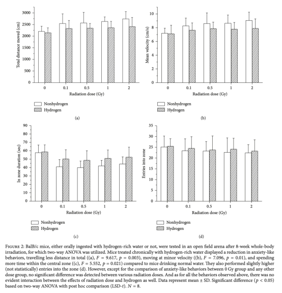 研究思路采用實(shí)驗(yàn)性設(shè)計(jì),將80只BALB/c雄性小鼠隨機(jī)分組,包括不同輻射劑量組(0.1 Gy、0.5 Gy、1.0 Gy、2.0 Gy)和假輻射對(duì)照組,每組再分為氫處理組和非氫處理組。小鼠通過飲用氫富水進(jìn)行干預(yù),接受8周分次輻射。輻射結(jié)束后,進(jìn)行行為測試(開放場地測試和強(qiáng)迫游泳測試)、血液學(xué)分析、染色體畸變檢測、精子形態(tài)評(píng)估、淋巴細(xì)胞轉(zhuǎn)化測試和組織病理學(xué)檢查。數(shù)據(jù)通過雙因素方差分析統(tǒng)計(jì),以評(píng)估H2的保護(hù)作用及與輻射的交互效應(yīng)。