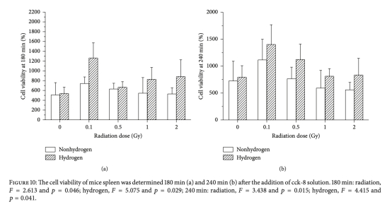 6 淋巴細(xì)胞轉(zhuǎn)化測試:測量脾淋巴細(xì)胞增殖能力,研究意義是評(píng)估免疫細(xì)胞活性,低劑量輻射可能刺激細(xì)胞活性,而高劑量抑制,H2能普遍改善細(xì)胞活力。數(shù)據(jù)來自圖10。
