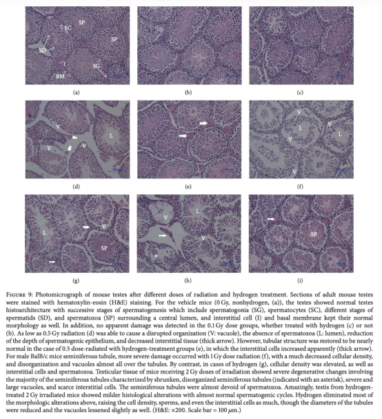 7 組織病理學(xué):檢查睪丸和骨髓組織的微觀結(jié)構(gòu)變化,研究意義是直觀顯示組織損傷和修復(fù),輻射導(dǎo)致組織退化,H2能減輕病理改變。數(shù)據(jù)來自圖4和圖9。