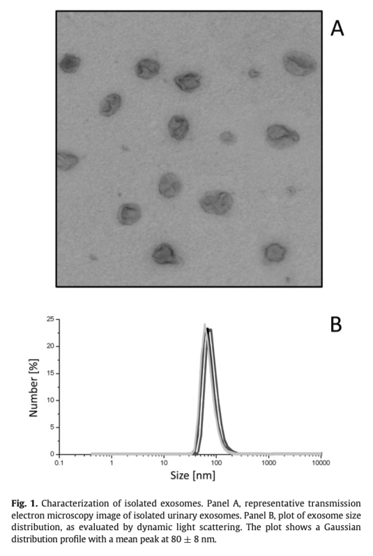 1 測量了外泌體的大小和形態,使用動態光散射和透射電子顯微鏡,結果顯示外泌體呈杯狀形態,大小分布峰值為80±8納米(來自圖1)。研究意義是確認外泌體的純度和物理特性,排除污染,為后續蛋白質組分析提供質量保證。