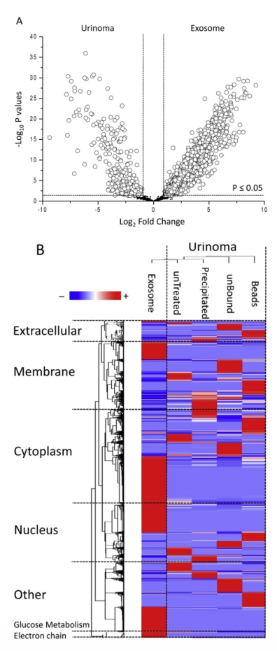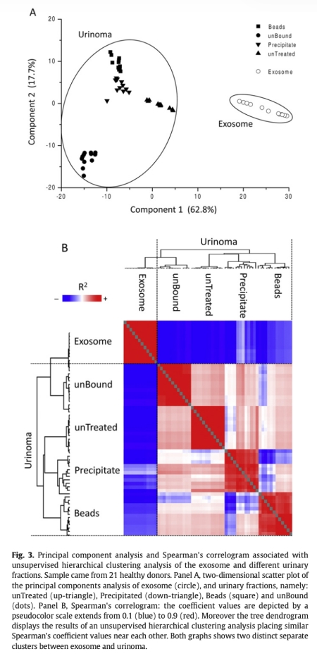 3 測量了蛋白質組的差異表達,通過主成分分析和熱圖顯示外泌體與urinoma形成獨立簇(來自圖3和圖4)。研究意義是證實外泌體蛋白質組與urinoma顯著不同,支持其作為獨立功能實體的觀點。