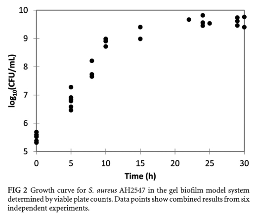 1 細菌生長曲線數據:通過活菌計數和圖像分析測量凝膠中金黃色葡萄球菌隨時間的變化。研究意義:顯示細菌在凝膠中初始快速生長后速率降低,模擬體內生物膜的慢生長特性,與囊性纖維化痰液中的細菌生長率相似。數據來自圖2和圖4。