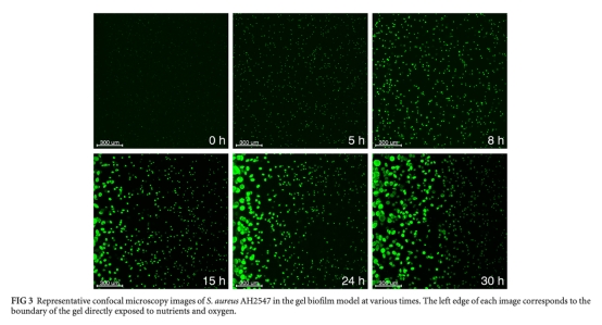 凝膠包埋的金黃色葡萄球菌作為生物膜感染模型表現出密集聚集體生長、氧限制、抗生素耐受和異質性基因表達