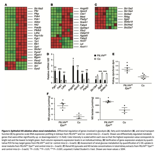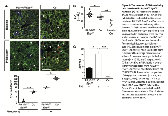 7 測量了EPO產(chǎn)生細(xì)胞(REPCs)數(shù)量,通過原位雜交。數(shù)據(jù)來自圖3。研究意義是顯示REPCs減少,表明上皮HIF激活間接影響間質(zhì)細(xì)胞可塑性。