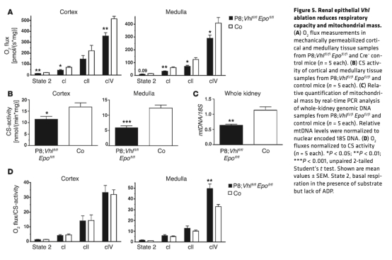 5 測量了線粒體功能,包括O2消耗速率和線粒體質(zhì)量(通過檸檬酸合酶活性和mtDNA)。數(shù)據(jù)來自圖5。研究意義是證明線粒體質(zhì)量減少和呼吸活性降低,直接關(guān)聯(lián)HIF介導(dǎo)的代謝重編程。