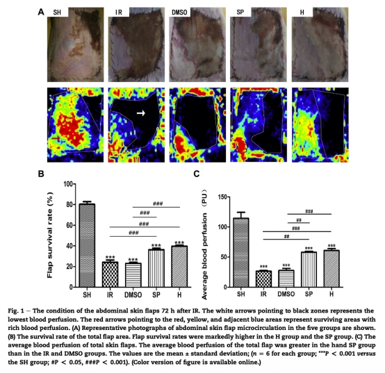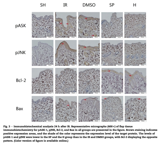 論文摘要指出,皮膚皮瓣轉(zhuǎn)移是整形外科中用于傷口修復(fù)和重建的基本方法,但缺血再灌注損傷導(dǎo)致的皮瓣丟失仍是一個嚴重問題。細胞凋亡是缺血再灌注損傷的主要原因。c-Jun N末端激酶是絲裂原活化蛋白激酶家族的成員,在細胞凋亡中起關(guān)鍵作用。本研究旨在驗證JNK激活在大鼠腹部皮膚缺血再灌注模型中對皮瓣凋亡的作用,并比較JNK抑制劑SP600125和富氫鹽水在皮膚缺血再灌注損傷中的保護效果。結(jié)果發(fā)現(xiàn),SP600125和富氫鹽水處理均能增加皮瓣存活面積、改善血流灌注、降低caspase-3活性,并調(diào)節(jié)凋亡相關(guān)蛋白表達,表明JNK信號通路介導(dǎo)了皮瓣凋亡,抑制JNK可能是一種治療策略。