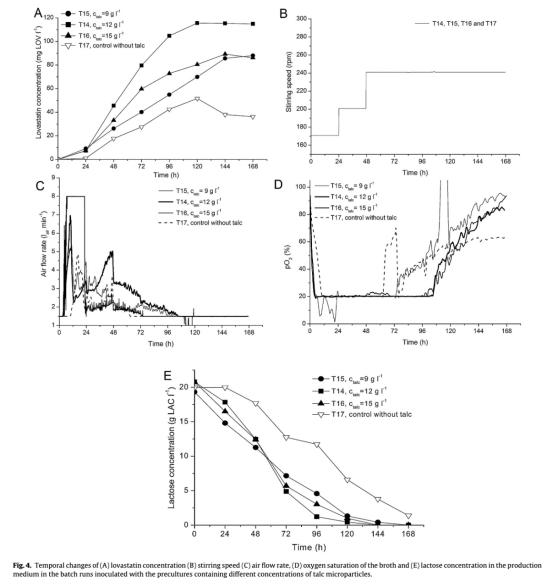 1 氧氣飽和度相關(guān)數(shù)據(jù):來自圖1,包括洛伐他汀濃度、攪拌速度、空氣流速、氧氣攝取率(OUR)和底物濃度隨時(shí)間的變化。研究意義:這些數(shù)據(jù)顯示氧氣飽和度對(duì)洛伐他汀生產(chǎn)有顯著影響,例如pO2=35%時(shí)滴度較高,但過高pO2(如40%)可能導(dǎo)致形態(tài)破壞和產(chǎn)量下降。結(jié)果幫助優(yōu)化生物反應(yīng)器的aeration策略,表明氧氣供應(yīng)需與碳源利用平衡以避免生產(chǎn)抑制。