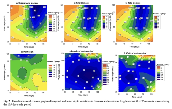 1 蘆葦生物量分配和形態數據:來自圖2。測量了不同水深下蘆葦的地上/地下生物量、葉長和葉寬。研究意義是揭示植物對水深增加的適應性策略(如深水促進地下生物量投資),表明水文條件通過改變植物資源分配間接影響沉積物氮循環過程。