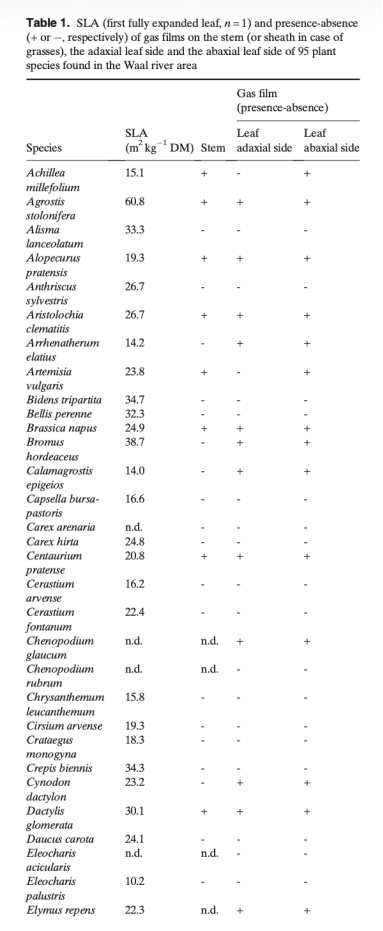 1 葉片氣體膜存在與否數據:來自Table 1。測量了95個物種的葉片氣體膜存在情況(莖、葉正面和背面)。研究意義是直接評估氣體膜作為淹沒耐受性狀的普遍性,顯示氣體膜在物種中的分布模式,有助于理解其生態作用。數據顯示氣體膜在很少洪水的區域更常見,可能與禾本科植物優勢相關。