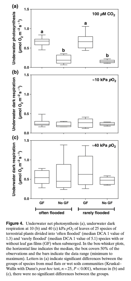 3 水下凈光合作用(Pn)和暗呼吸(Rd)數據:來自Fig. 4。使用Unisense電極測量O2濃度,計算Pn和Rd。結果顯示有氣體膜的物種Pn比無氣體膜物種高3.8倍,但Pn與洪水梯度無顯著相關性。研究意義是量化氣體膜對水下氣體交換的增強效果,證實其能提高光合效率和呼吸作用,從而支持植物淹沒生存。