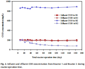 數據來源:圖2展示了整個運行期間反應器R1和R2的進出水化學需氧量濃度。