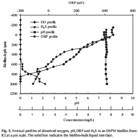 直接證實生物膜的分層結構與SRB的生態位:溶解氧微電極的數據清晰顯示了一個有氧表層和深層缺氧區,這解釋了為什么好氧和厭氧微生物(如SRB)能在同一生物膜中共存。H?S微電極的數據直接將SRB的活性定位在深層缺氧區(750-1000微米),這是證明SRB在如此厚的油砂處理水生物膜中起作用的最直接證據。