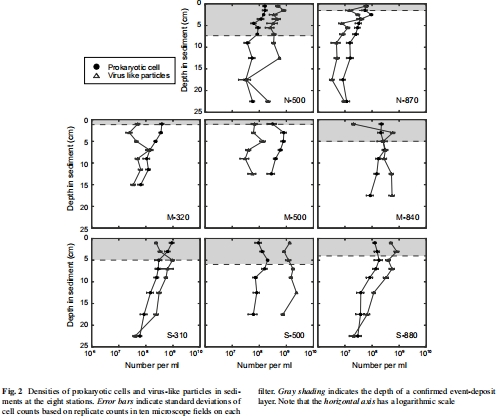 數據內容:測量了沉積物不同深度間隔的原核細胞和病毒樣顆粒密度。結果顯示,在某些站點(如M-500, S-500, S-880),原核細胞豐度在表層事件沉積層中較低,而在亞表層(如2-4厘米)出現峰值。
