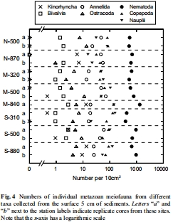 數據來源:圖4展示了各站點小型動物的類群組成;圖5展示了線蟲和橈足類等的垂直分布。