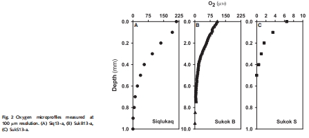 數(shù)據(jù)內(nèi)容:Unisense微電極測量顯示,Siq13站點沉積物-水界面處O?濃度最高(212.4 μmol L?1),但在約1.0毫米深度處耗盡;SukB13和SukS13站點的O?消耗深度分別為10.0毫米和0.5毫米。