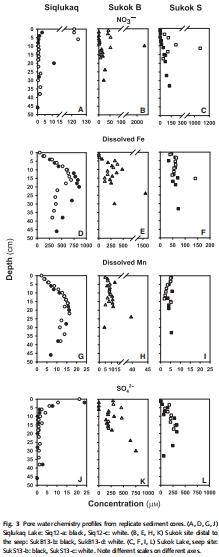 數(shù)據(jù)內(nèi)容:測量了孔隙水中的NO??、SO?2?、Fe、Mn等濃度隨深度的變化。例如,Siq12站點表層SO?2?濃度較高(約8.74±8.47 μM),在8厘米以下急劇下降;Fe濃度在12-20厘米深度達到峰值(如854.94 μM)。