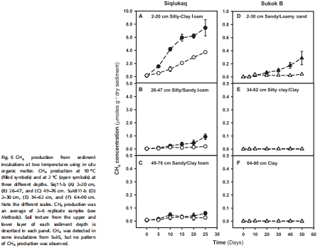 數(shù)據(jù)內(nèi)容:培養(yǎng)實驗顯示,Siq11沉積物在10°C下產(chǎn)甲烷速率最高(上層沉積物達7.4±1.2 μmoles CH?/g干重/25天),且10°C下的速率顯著高于2°C。SukB11站點產(chǎn)甲烷速率極低,SukS11站點未檢測到生物產(chǎn)甲烷。