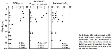 數(shù)據(jù)內(nèi)容:qPCR分析顯示,僅在Siq11站點檢測到顯著的mcrA基因拷貝數(shù)(最高達1.9 x 10? copies/g沉積物)。脂質(zhì)分析顯示Siq站點古菌醇濃度遠高于Suk站點。