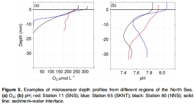 研究意義:高分辨率剖面揭示了沉積物內部的氧化還原結構和化學梯度。氧氣滲透深度反映了耗氧速率和傳輸機制(擴散 vs. 平流)。pH最小值指示了從深層上涌的還原性物質被氧化的界面。