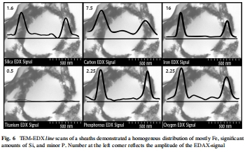 數據內容:TEM顯示有機質鞘結構被無定形或弱結晶的沉淀物包裹。EDX線掃描顯示這些結構上鐵、硅均勻分布,并含有少量磷。