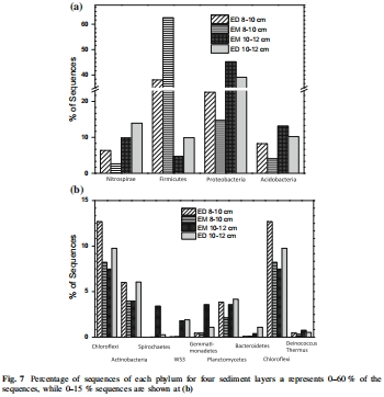 數據內容:原核細胞密度在沉積物最表層(0-0.5厘米)較低,在0.5-1厘米處達到峰值后隨深度呈指數下降。焦磷酸測序顯示,鐵層(如ED 8-10厘米,EM 10-12厘米)與其上覆層相比,含有更少的革蘭氏陽性菌,更多的變形菌門細菌,以及較高比例的硝化螺旋菌門物種。鐵層中一個顯著特征是NC10門的候選甲烷氧化菌(Candidatus Methylomirabilis)占主導。