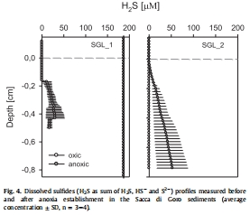 數據內容:使用Unisense H?S微電極測量了沉積物表層H?S濃度的垂直分布。結果顯示,僅在薩卡迪戈羅潟湖的站點檢測到H?S積累,且在SGL_1站點缺氧條件下濃度顯著升高(最高達180 μM)。