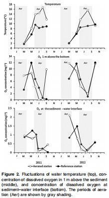 數(shù)據(jù)內(nèi)容:曝氣站點(diǎn)的近底層水溫顯著高于未曝氣站點(diǎn)(例如八月高7-8°C)。當(dāng)包含所有數(shù)據(jù)時(shí),曝氣站點(diǎn)的平均溶解氧濃度較高,但若僅分析夏季分層期,則未曝氣站點(diǎn)濃度更高。夏季兩者均出現(xiàn)缺氧。