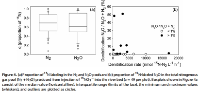數據內容:反硝化多以N2為主,但部分樣品N2O積累最高達51%;15N在N2和N2O庫中的標記比例無顯著差異(圖4a)。