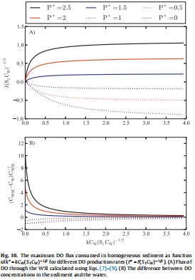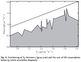 DO通量控制機(jī)制:J受水側(cè)湍流(k)和沉積物側(cè)過程(P_ef和r?2)共同控制。當(dāng)k(無量綱參數(shù))<0.2時(shí),J受水側(cè)限制;k>3時(shí),受沉積物過程限制(見Fig. 10)。