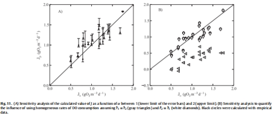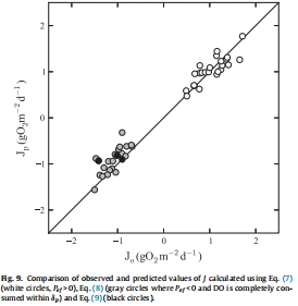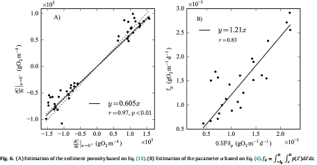 模型有效性:提出的代數(shù)表達(dá)式(Eq. 7-9)成功預(yù)測了J,與觀測值高度相關(guān)(R=0.98),驗(yàn)證了模型在考慮沉積物垂直異質(zhì)性和底棲生產(chǎn)時(shí)的準(zhǔn)確性。驗(yàn)證結(jié)果見Fig. 9。