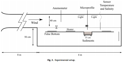 實(shí)驗(yàn)驗(yàn)證:在風(fēng)洞實(shí)驗(yàn)設(shè)施中進(jìn)行,水槽深度可變(3或5 cm),放置自然沉積物(含微藻層)。通過控制光照(模擬晝夜循環(huán))和風(fēng)速,測量DO微剖面。實(shí)驗(yàn)設(shè)置如圖Fig. 3.所示。